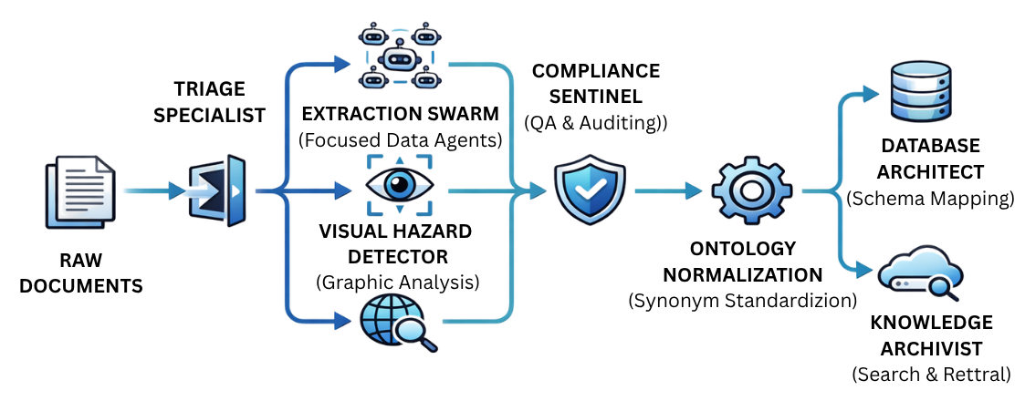 - Incoming documents are first classified and routed dynamically based on their structure and content. Specialized extraction agents then process the documents to extract structured chemical data, including names, IDs, and composition details.
